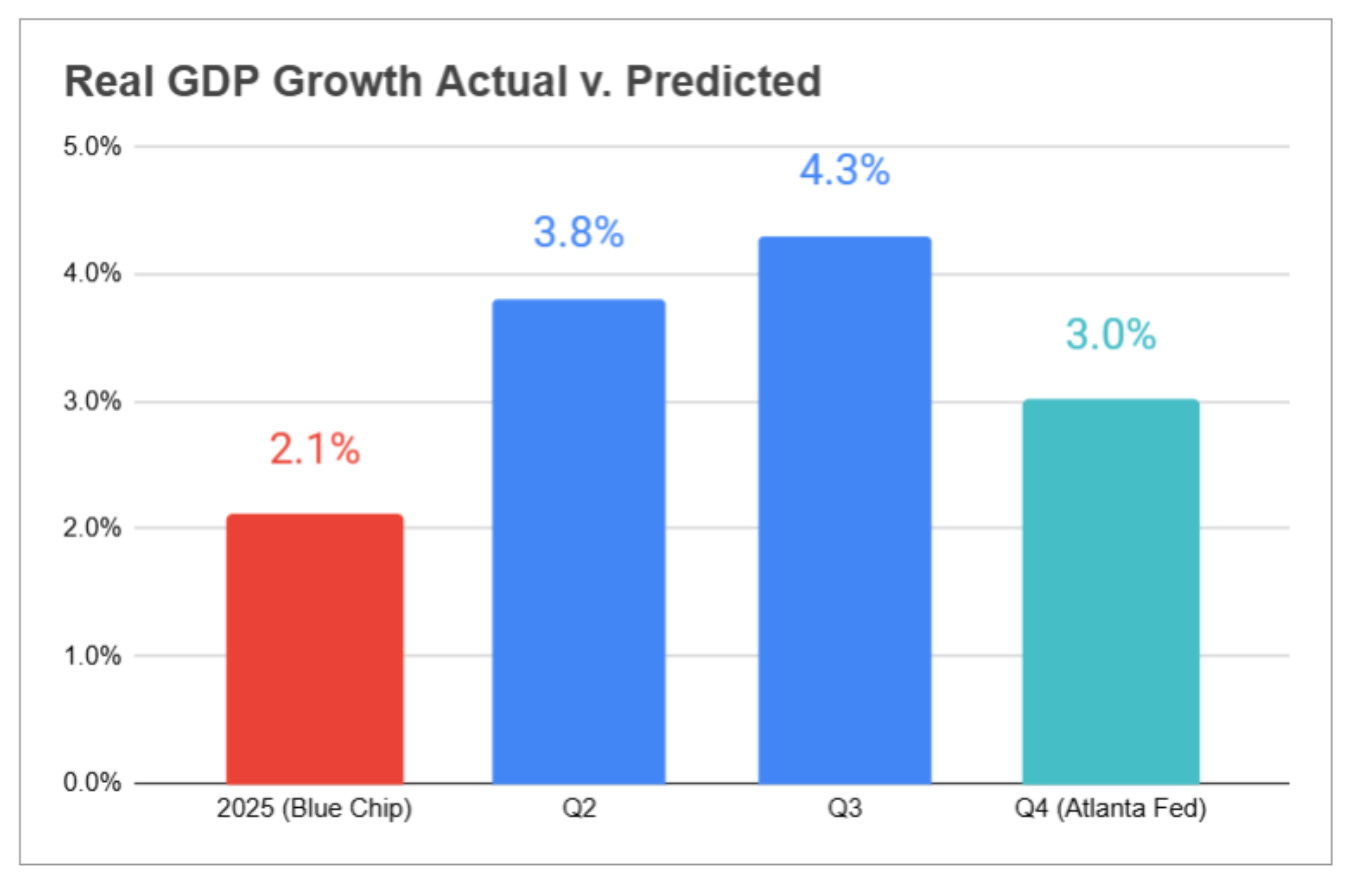 Inflation unexpectedly eased last month to just 2.7% over the last twelve months, according to the latest survey from the Bureau of Labor Statistics.3 Even worse for the ‘any tax but tariff tax’ crowd, was the Commerce Department report showing a 4.3% GDP growth spurt in the third quarter.4